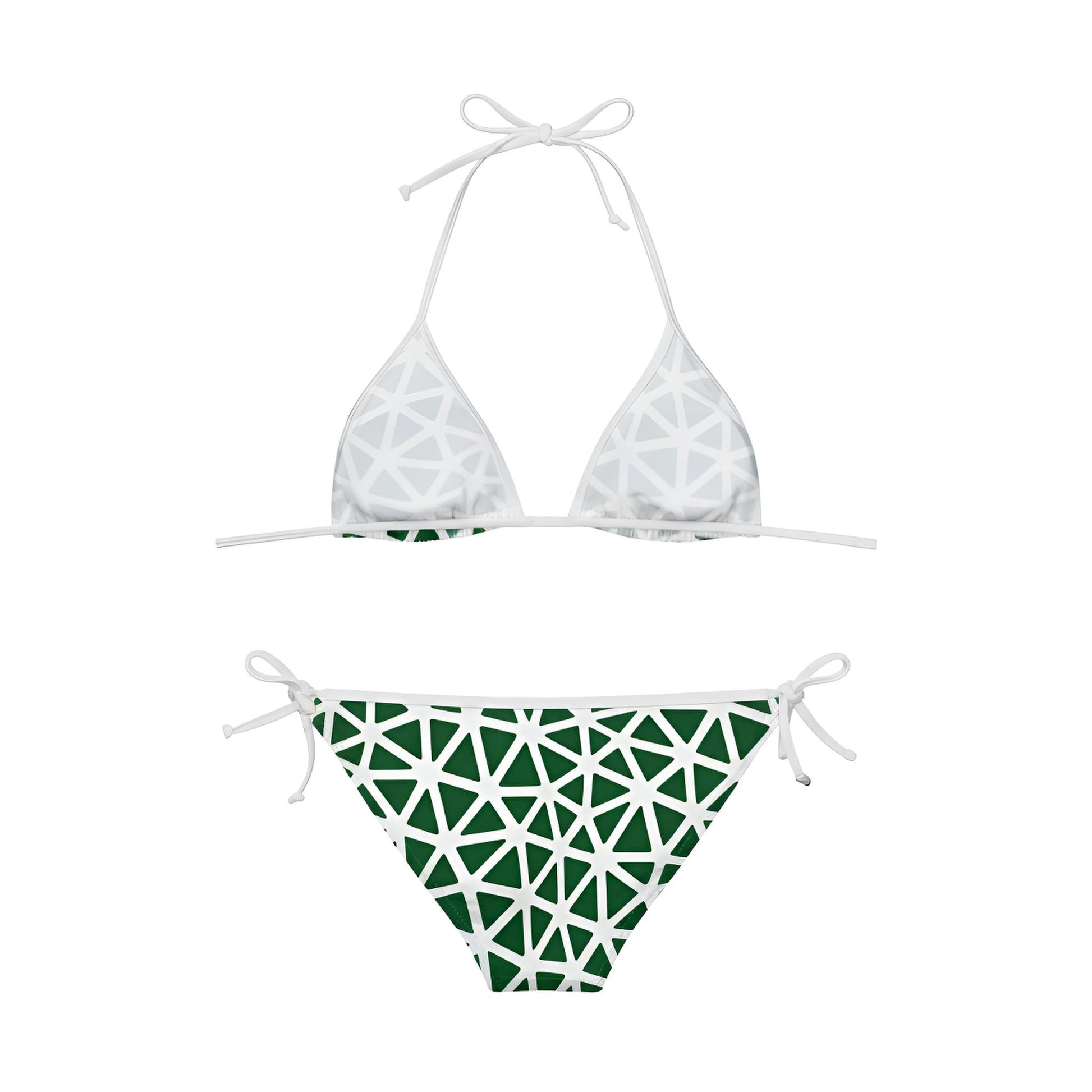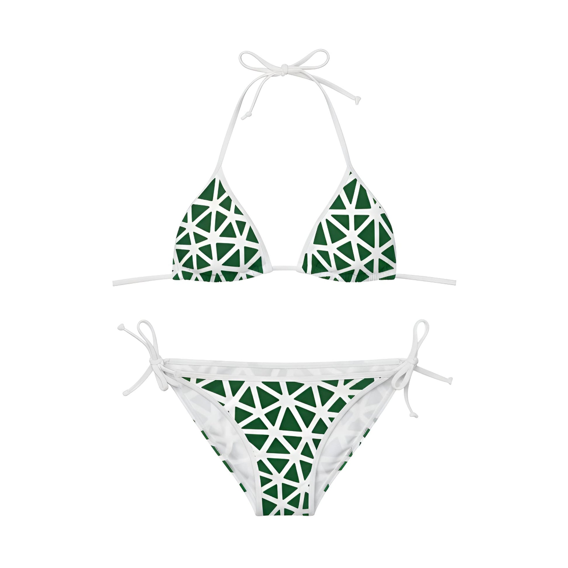 The svrf kini, a classic women's string bikini with a green mid-century modern geometric print, perfect for vintage lovin' surfgirls looking to turn heads on the beach. This two-piece swimsuit comes with padded inner lining, vibrant colors, and elastic straps for a comfortable and stylish beach look. Made from 85% polyester and 15% spandex, this bikini is light, stretchy, and resistant to chemicals, making it ideal for pool parties, beach vacations, and summer celebrations.